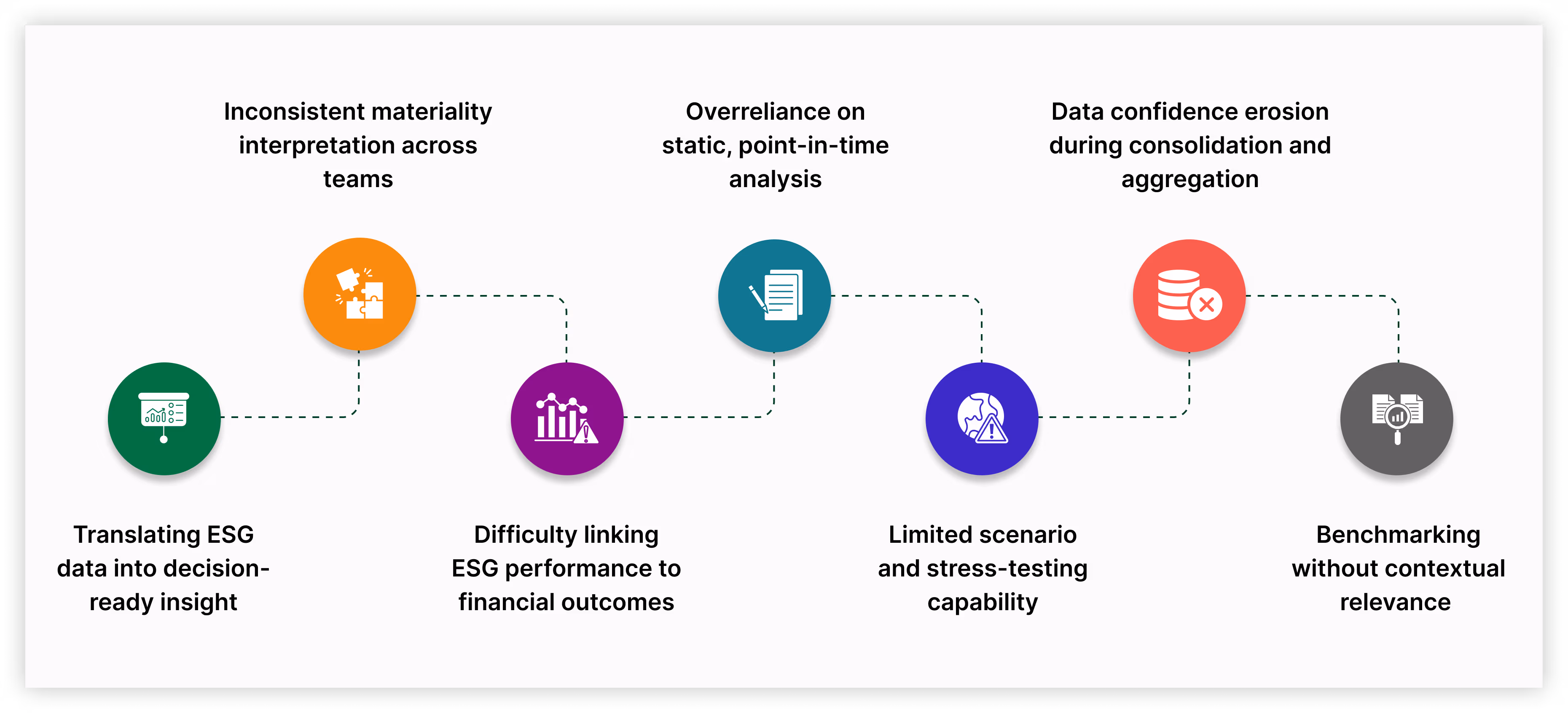 Even organisations that have invested time and resources into ESG compliance often encounter deeper analytical challenges once reporting matures. These issues go beyond basic data collection and reflect how ESG information is interpreted, stress-tested, and used in decision-making.