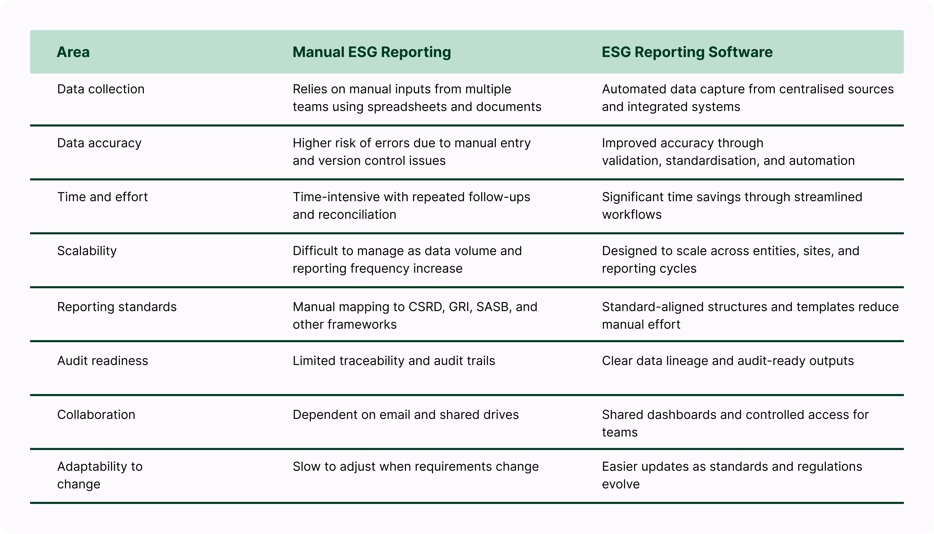 Choosing between ESG reporting software and manual ESG reporting ultimately comes down to scale, complexity, and risk tolerance. While manual methods may work in limited situations, they become increasingly difficult to sustain as reporting requirements expand. A side-by-side comparison highlights where the two approaches differ most clearly.