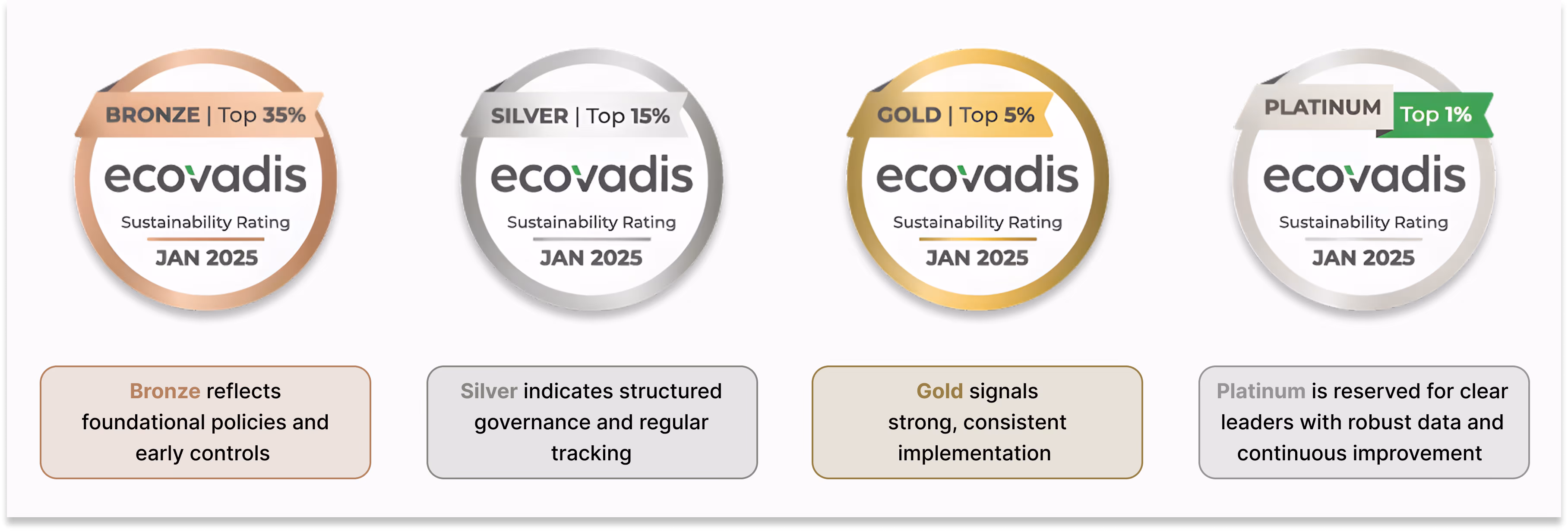 Each assessment results in a score from 0 to 100, often linked to a medal level: Bronze, Silver, Gold or Platinum, each signalling a different stage of maturity. Bronze typically reflects a company that is putting the basics in place with core policies and initial controls. Silver indicates a more structured approach, with clearer governance and regular tracking of ESG performance. Gold points to strong, consistent implementation where sustainability is embedded across operations and the supply chain. Platinum is reserved for clear leaders, with robust data, independent evidence and continuous improvement built into business decisions. For buyers, this compresses a complex picture into a comparable metric they can use across suppliers. For suppliers, it turns “prove you are sustainable” into a tangible checklist with a visible path to move from one medal tier to the next.