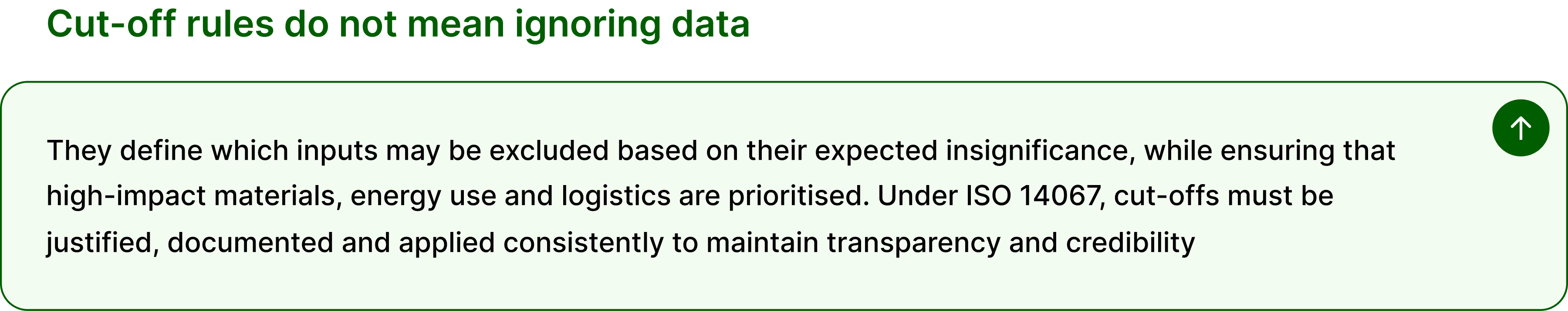 ISO 14067 requires that cut-offs are justified, documented and applied consistently. This prevents selective exclusion of inconvenient data and maintains transparency.