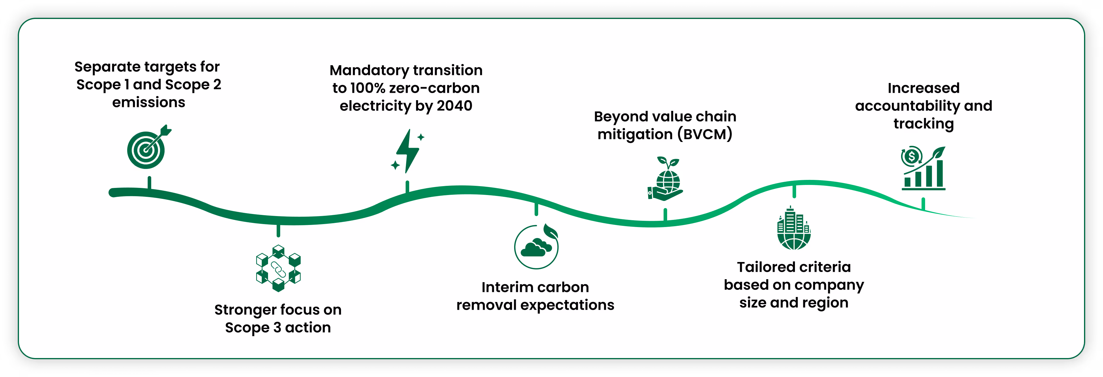 - Separate targets for Scope 1 and Scope 2 emissions: Companies can no longer combine these into a single target. This separation demands clear, dedicated strategies for operational emissions and electricity procurement