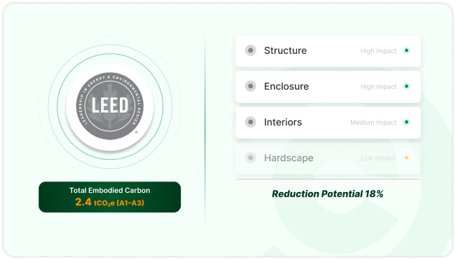 Quickly estimate your building’s embodied carbon (A1–A3) and understand how your project performs against LEED v5 MRp2 and MRc2 requirements.